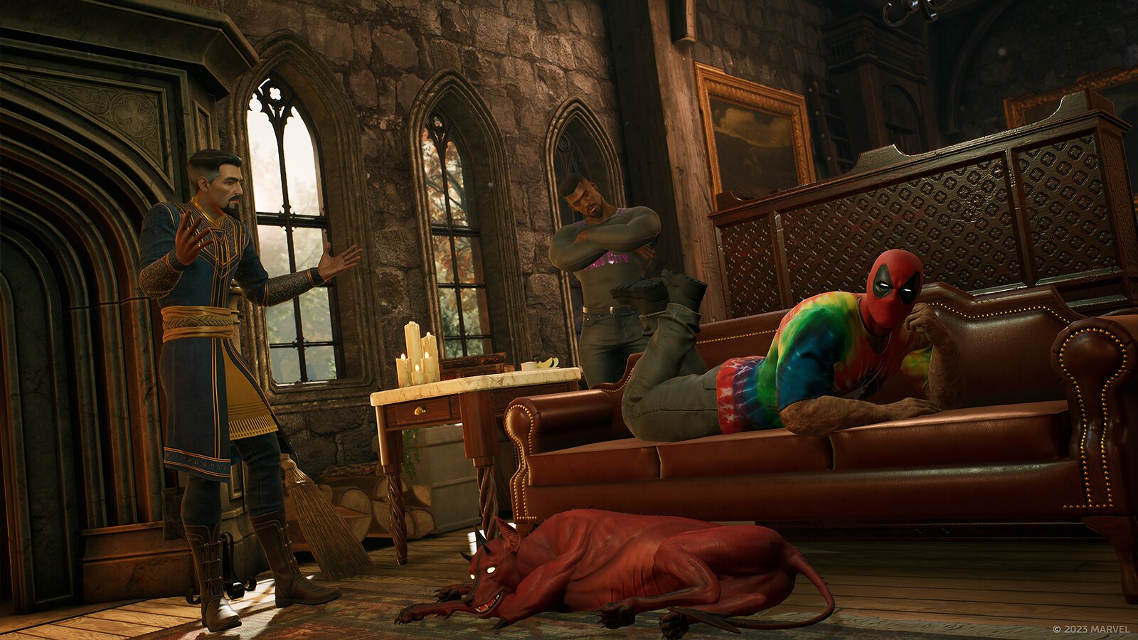 Like the other Midnight Suns heroes, you can see Deadpool relaxing in and around the Abbey between missions, and if you want to pursue his friendship, you can ask him out. Just know that, because of his volatile and unpredictable nature, Deadpool doesn’t merely “like” any hangout activity; he “loves” or “dislikes” any way that you spend time together!