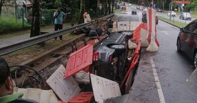 According to Wangsa Maju district police chief, Ashari Abu Samah, the vehicle driven by a 32-year-old woman collided with a makeshift plastic barrier on the left lane being repaired and fell into a pit.