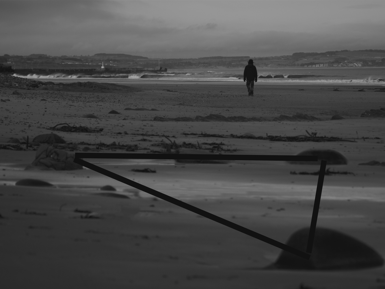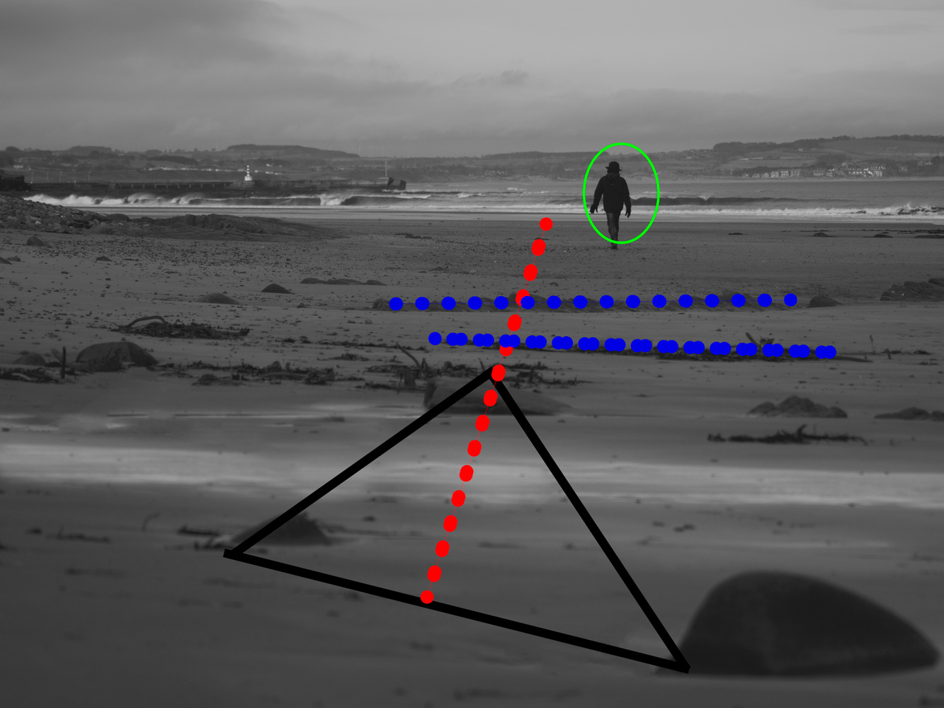 In the following image, where I have moved near the rocks in the scene, the version on the left forms a triangle facing the scene. The eye follows an imaginary line shown by red dots. Even though that line is cut by a line of seaweed and a line of rocks (blue dot), the eyes continue to be directed towards the person because we give people more visual weight. In the right hand version, I have cloned the rocks to different positions. Now, the top of the triangle is at the base on the opposite side making the eye not move towards the figure. However, because of the strong visual weight we assign to others, our eyes still find the person eventually.