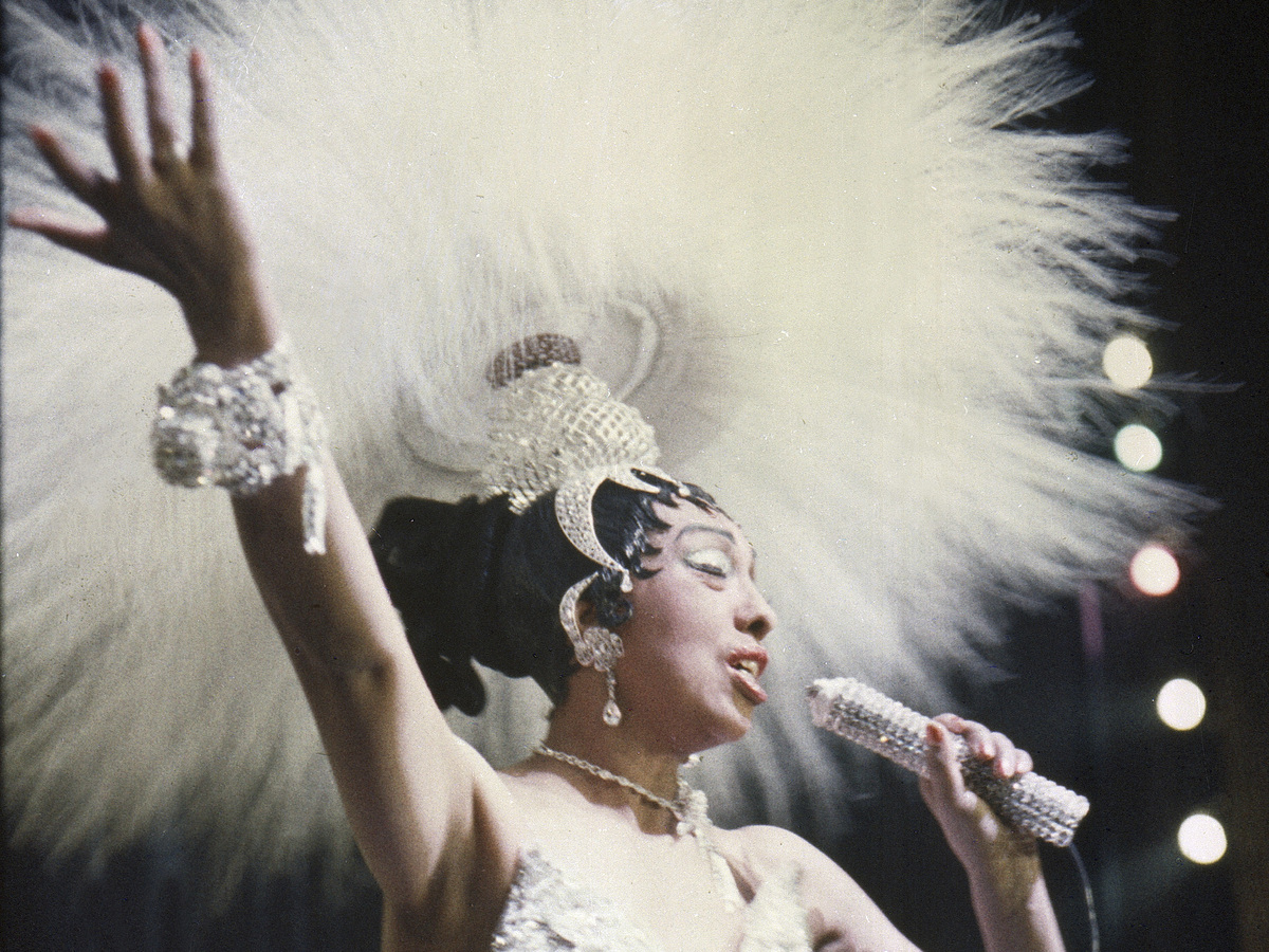 Josephine Baker holds a rhinestone-studded microphone as she performs during her show “Paris, mes Amours” at the Olympia Music Hall in Paris, France, on May 27, 1957.