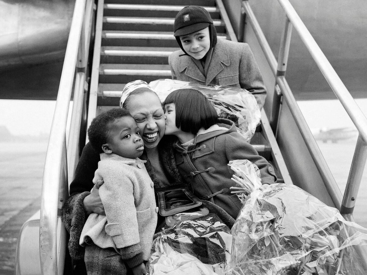 Josephine Baker is welcomed by three of her children after a tour in 1956, at Le Bourget airport near Paris.