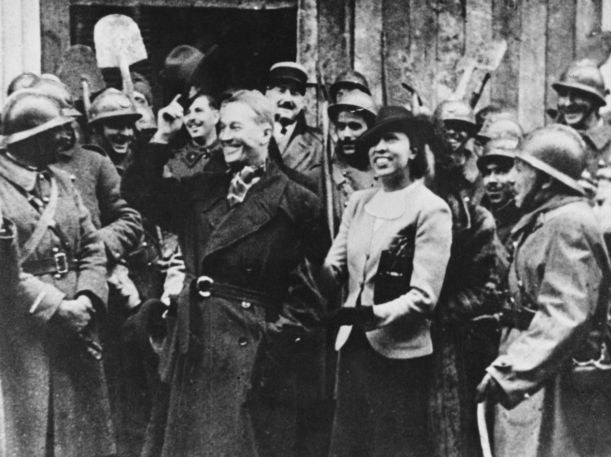 Entertainers Maurice Chevalier and Josephine Baker are cheered by officers and men of the French Army as they arrive at the front during World War II, circa 1940.