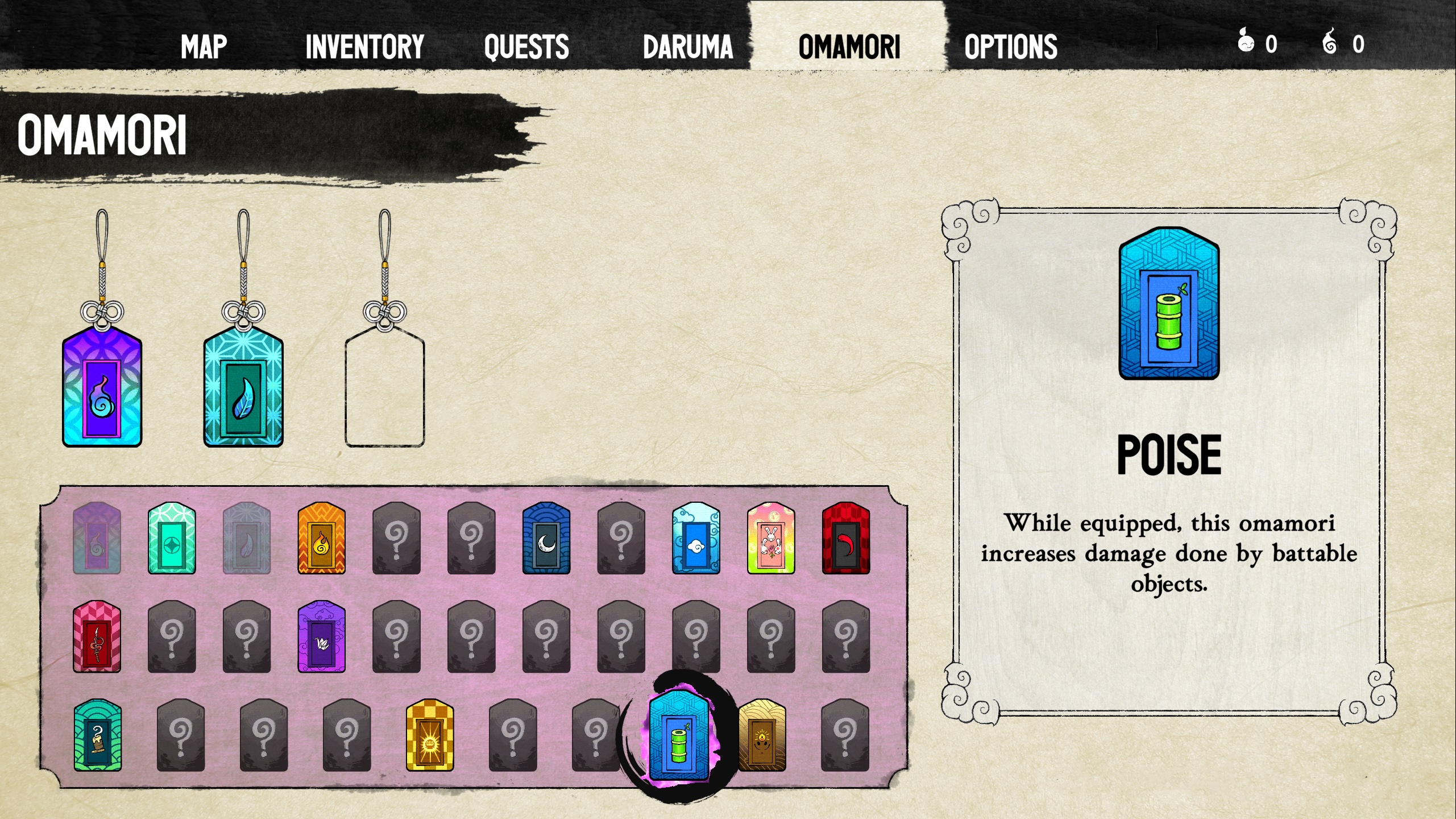 While we take a lot of inspiration from 2D action exploration games, the world and gameplay also draw a lot from Japanese folklore and traditions. The character Bō is partly inspired by the stories of Princess Kaguya and Momotaro. Many of the yokai and monsters Bō fights represent our own interpretations of classic folk tales, like your confrontation with the giant Hashihime who guards the bridge in Bō’s world. Bō powers up her Daruma Doll by finding ink to add eyes, which in our real world is associated with achieving goals and good luck. Bō can also collect and equip a variety of Omamori, amulets that give you bonuses to customize your gameplay.