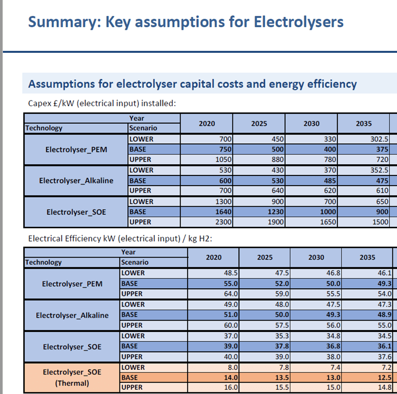 I gather that PEM (Proton Exchange Membrane) technology is the technology most likely to be implemented. Baseline costs in 2025 are forecast to be £500/kW.