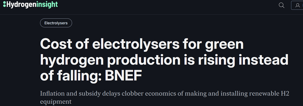 Researcher BloombergNEF (BNEF) found that the cost of manufacturing and installing electrolyzers to produce green hydrogen in China, the US and Europe - three of the world’s largest markets - has increased by more than 50% compared to with last year. descending analysis of it indicated earlier.